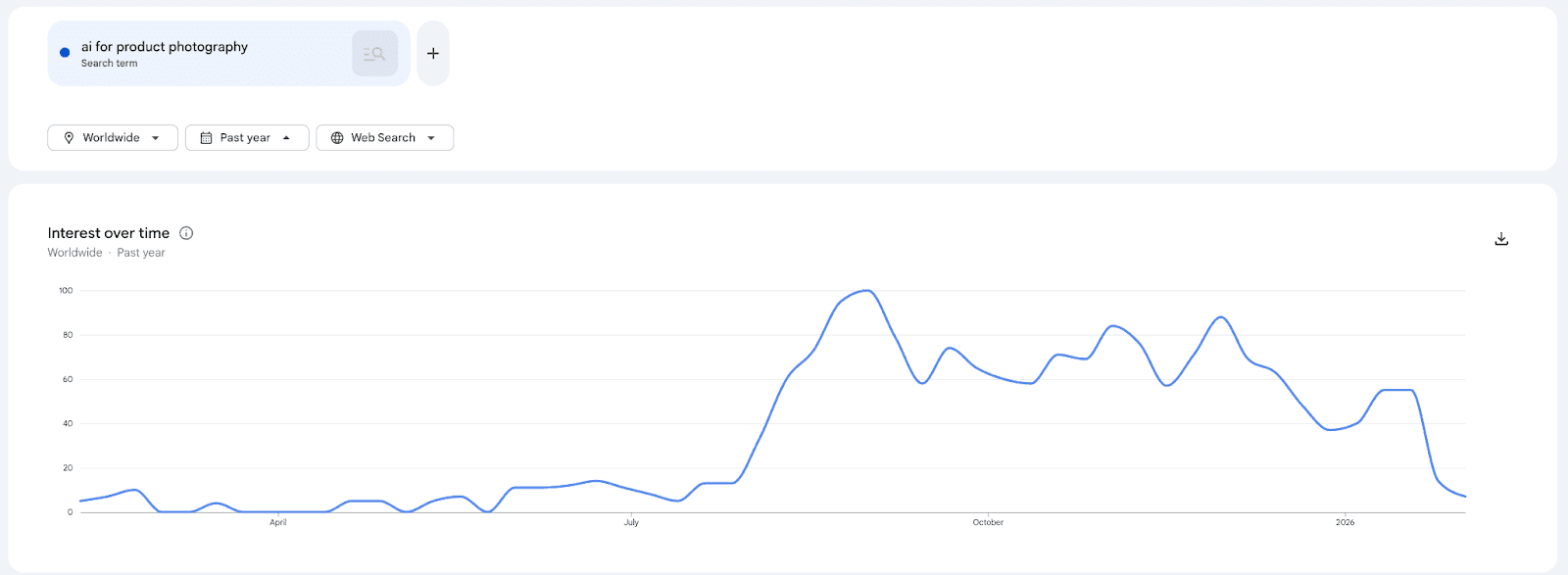 AI product photography is the use of generative AI to create, edit, or enhance product images for e-commerce store designs and marketing campaigns. According to Google Trends, searches for “AI for product photography” are up 50% globally compared to the previous year and up 40% over the last three months.