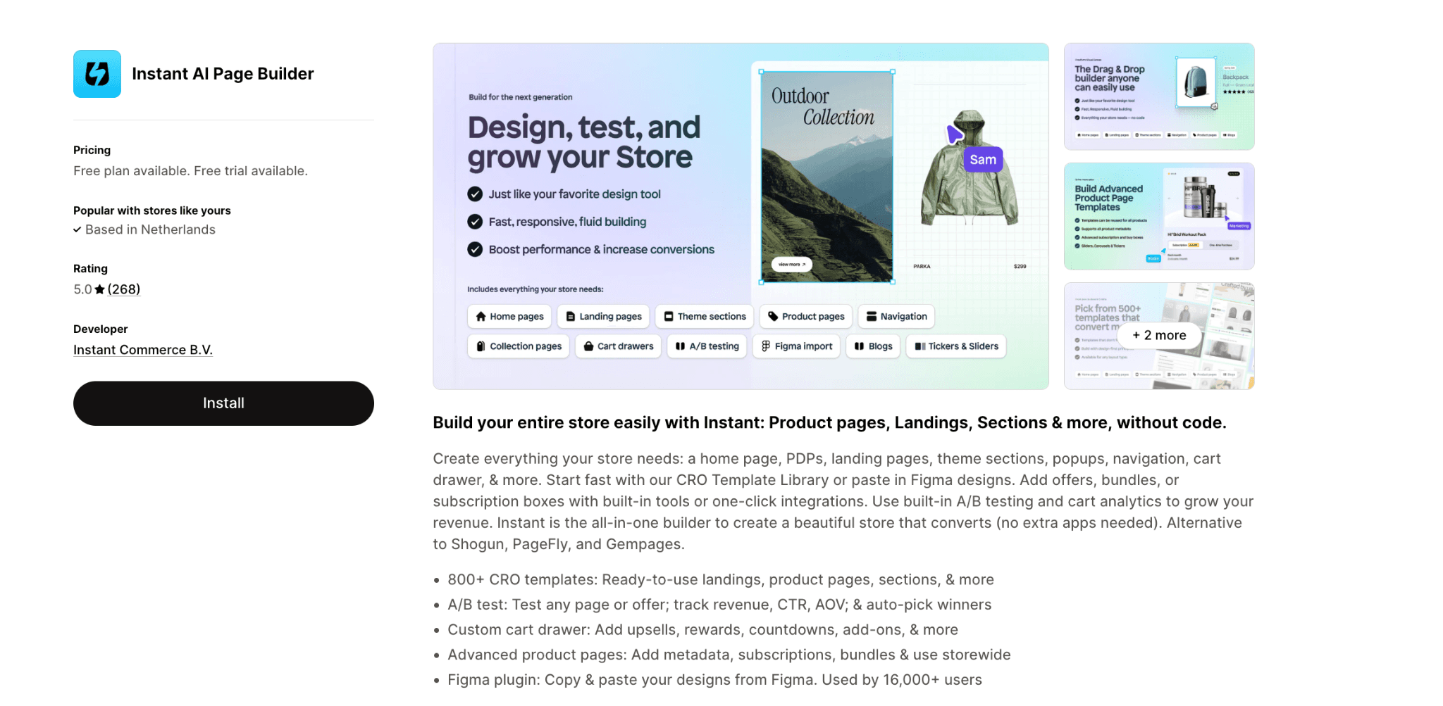 Instant AI Page Builder | 5.0★ (268) | Custom bundle page design & A/B testing | Publish 1 page/section/blog post | $39/mo |