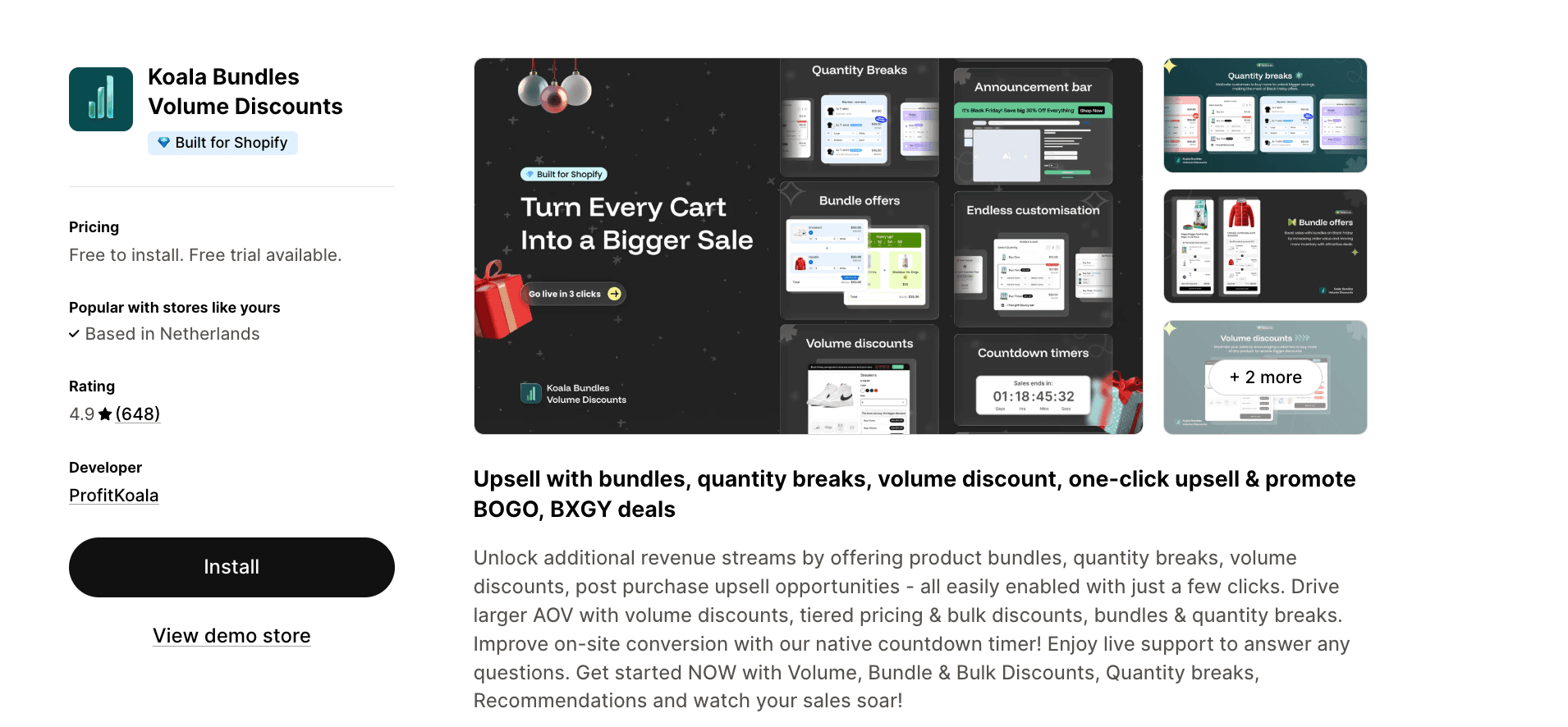 Koala Bundles | 4.9★ (648) | Post-purchase upsells & countdown timers | Development stores only | $12.99/mo |