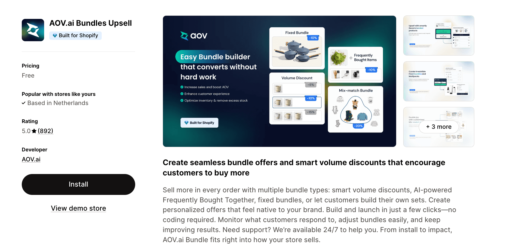 AOV.ai Bundles upsell | AI-recommended bundle types | 5.0 stars, 800+ reviews | Free |