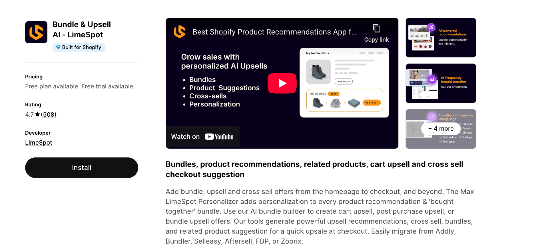 Bundle & Upsell AI - Limespot | AI Bundle Builder | 4.7 stars, 500+ reviews | $6.99 - $50/month |