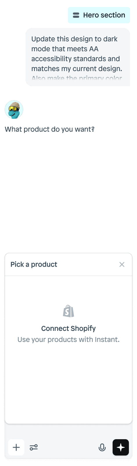 Let AI build anything you need for your Shopify store. From browsing the web for inspiration to pixel-perfect prompt execution.